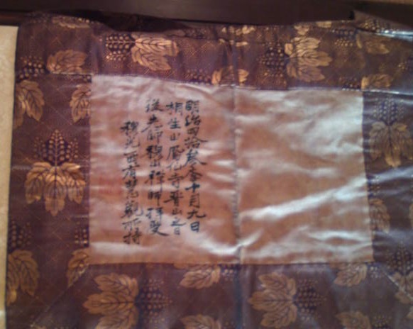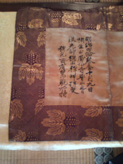 第二七世穆光慧観大和尚明治43年10月9日に鳳仙寺晋山の日、鳳仙寺二四世穆山瑾英大和尚から頂いたものです。写真の絡子は甘楽町宝積寺にあります。