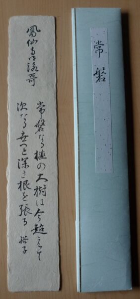 お堂内には、両祖・道元禅師・瑩山禅師、開山・勅賜仏広常照禅師、歴代住職の木像や御位 牌、さらに開基・由良成繁公一族一門、遠祖・新田義貞公一族一門、ご朱印下賜・徳川家康公一族一門、開山堂建立者・長沢家先祖代々の御位 牌等が安置されています。それだけに、ここは特段の心くばりをしたい大切なお堂となっています。下の写真は、常磐の和歌です。