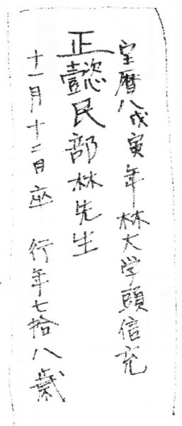 長澤是水の師 林大学頭信充の位牌〈薄板に書かれ是水が書いて親戚に各家へ配った物〉
